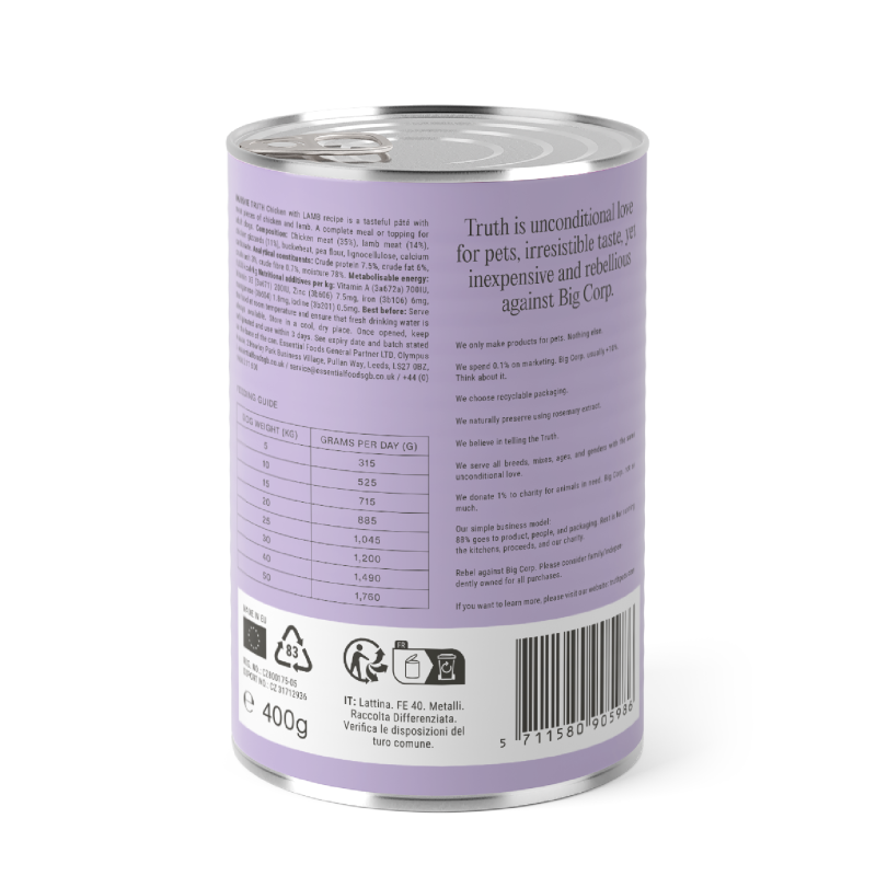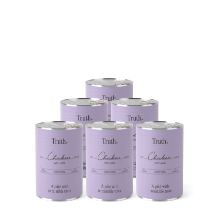 Notre recette PÂTÉE TRUTH LAMB est une savoureuse pâtée contenant des morceaux de viande de poulet et d'agneau.