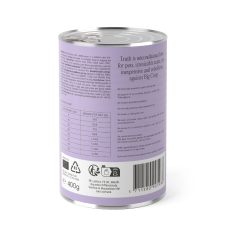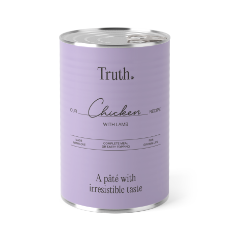 La PÂTÉE TRUTH LAMB à base de viande de poulet et d'agneau pour chiens ADULTES de toutes races et de toutes tailles.