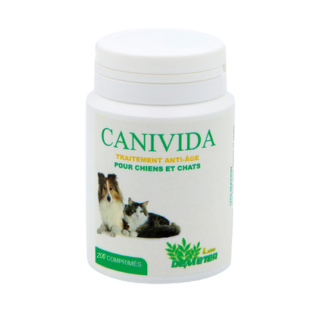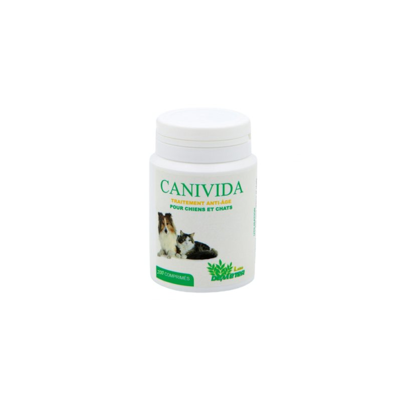 Traitement antiâge pour vieux chiens et vieux chats à base d'extrait d'Yam riche en DHEA , d'acides gras oméga 3, de Silicium et de probiotiques.
