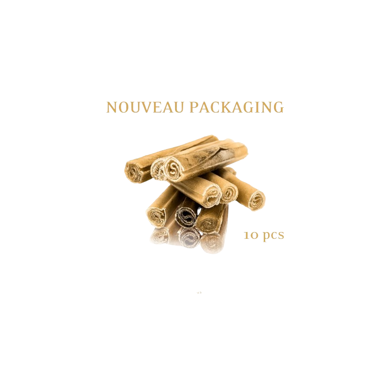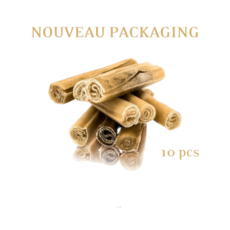 100% cuir de vachette séché. 12,75cm de long et 1,5 cm de diamètre. 25-30gr par barre.