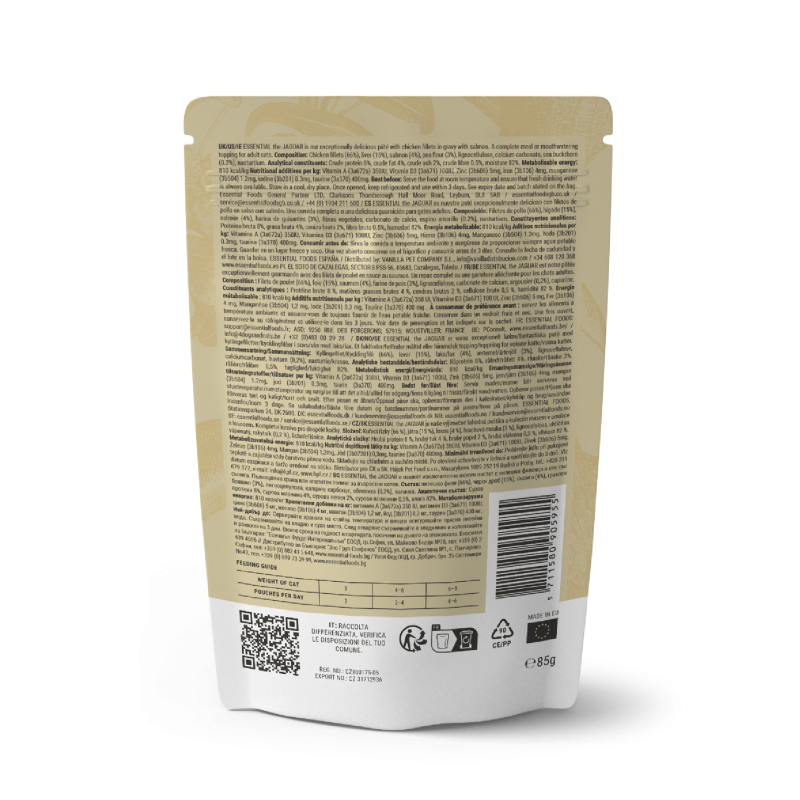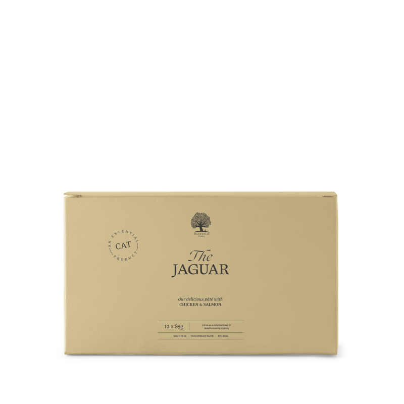 ESSENTIAL the JAGUAR est notre délicieuse pâtée avec des filets de poulet en sauce au saumon.